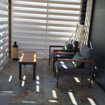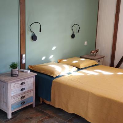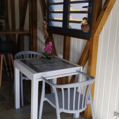 Chambre climatisée, lit 160, 2 chevets et armoire.Terrasse couverte, 2 fauteuils et banc table basse.