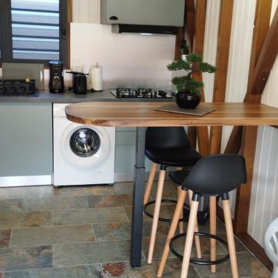 Logement neuf avec un équipement moderne et cuisine équipée, avec table bar et 2 tabourets, ainsi que table à rallonge et 2 chaises. Salon avec canapé et TV.